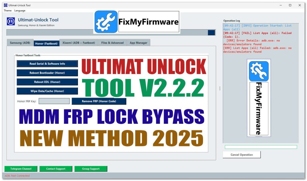 Ultimat Unlock Tool V1.0 for a while now, and it’s honestly one of those tools that just makes life easier if you deal with Android phones regularly. Whether you’re working on a Samsung, Xiaomi, or Honor device, it covers pretty much everything like removing FRP or MDM locks, rebooting into different modes, resetting the phone, or even managing apps and files. What I really like is that it’s straightforward no complicated setup, just plug in the phone and start working. It also comes in handy when you need to push or pull files, back up data, or run custom ADB or Fastboot commands. If you do any kind of mobile repair or unlocking work, this tool is definitely worth keeping in your kit and it’s totally free, which is a bonus.